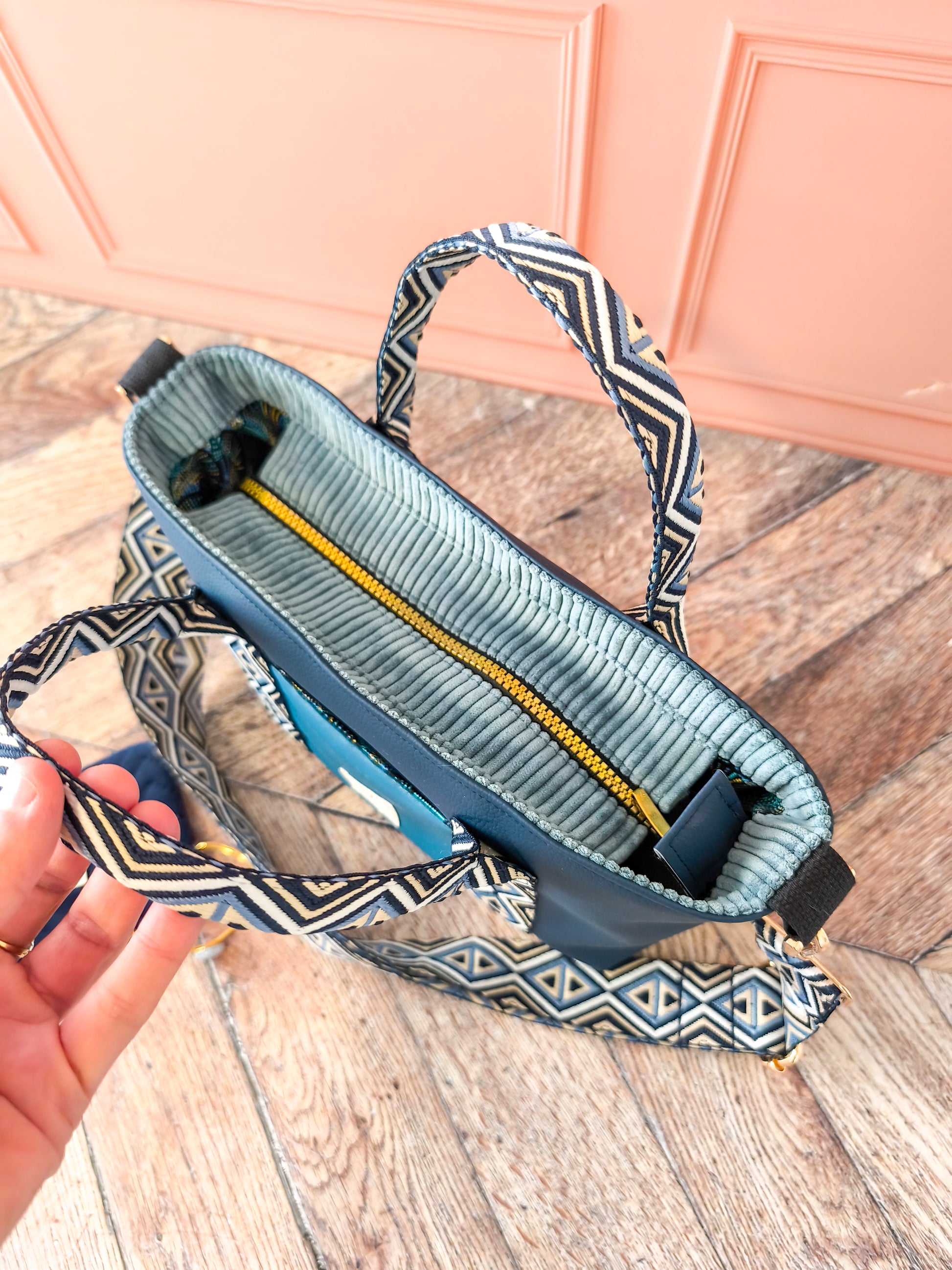 Ce cabas a été cousu dans un simili bleu profond, à la fois souple et résistant. La poche frontale turquoise apporte un joli contraste, et la sangle ethnique bleue donne ce style moderne que j’aime utiliser sur certains modèles.