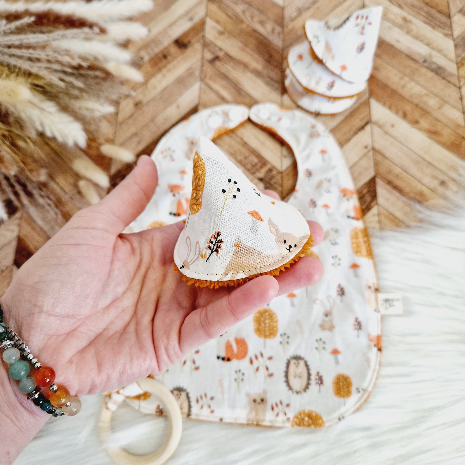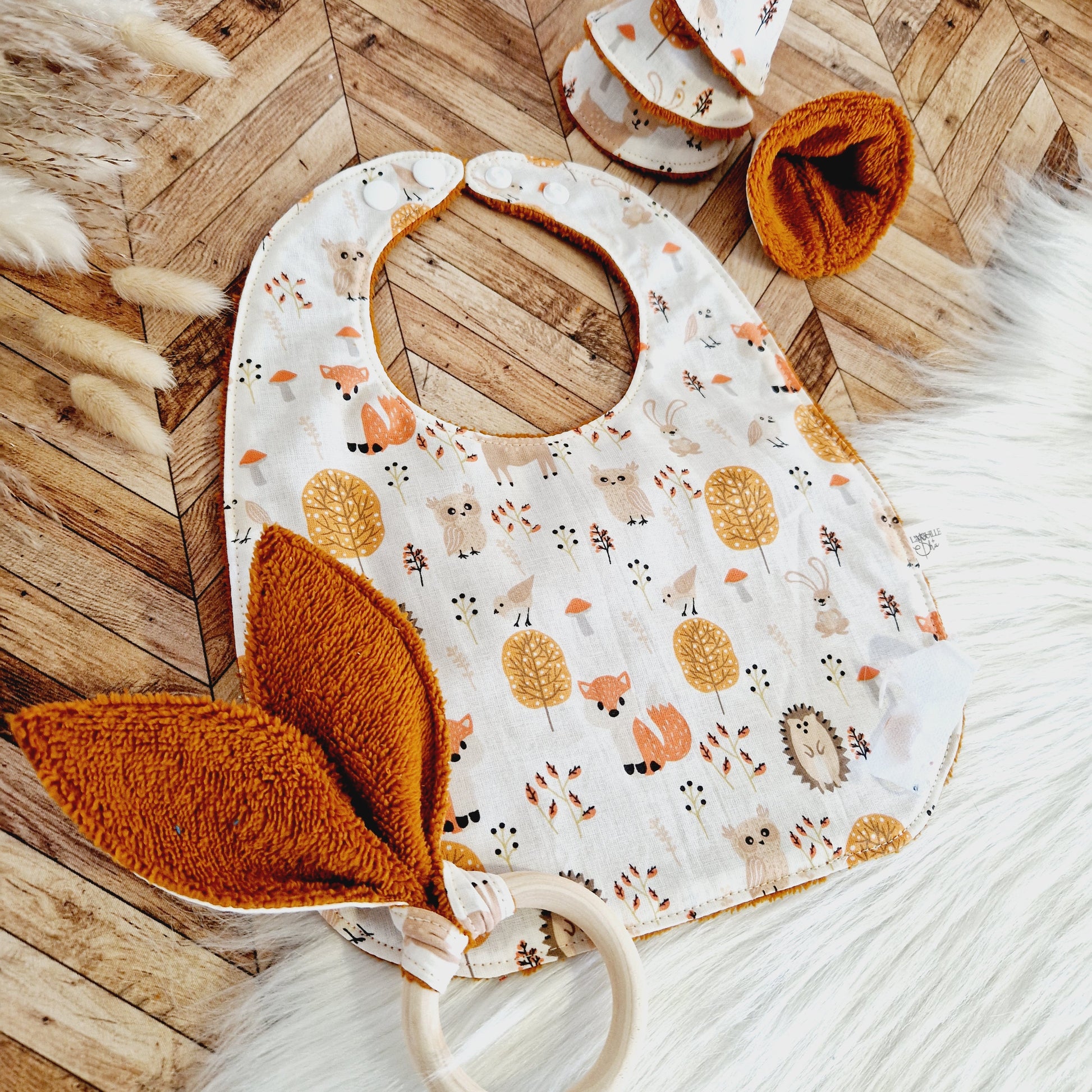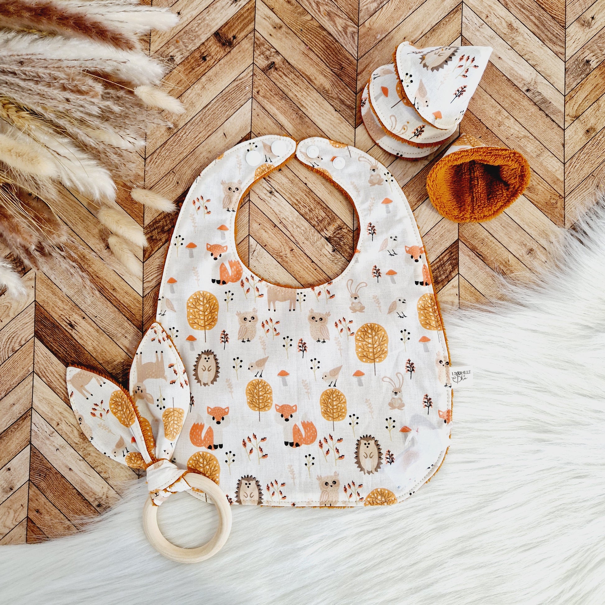 Ce coffret comprend un bavoir pratique, un lot de 4 tipis pare-pipi et un anneau de dentition.