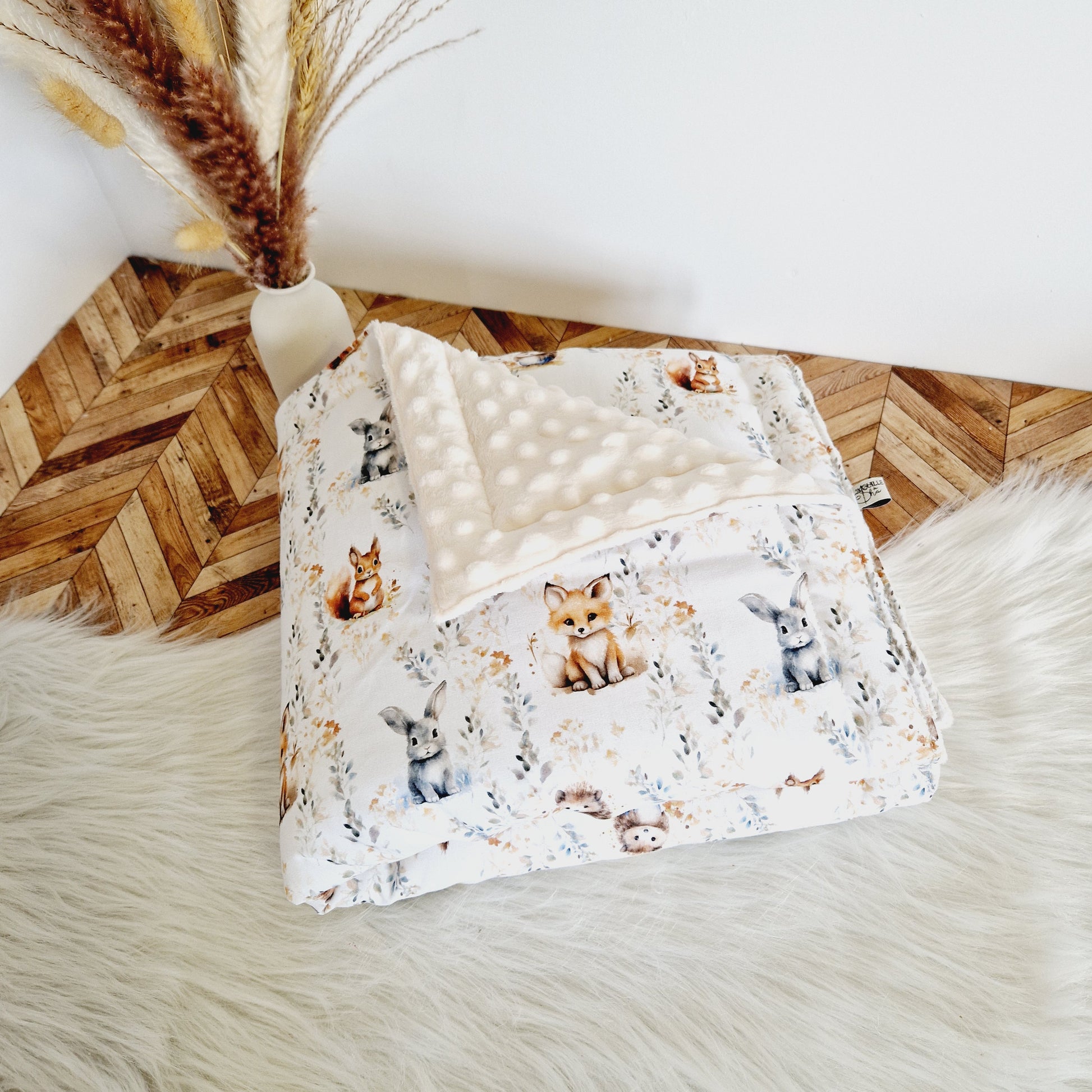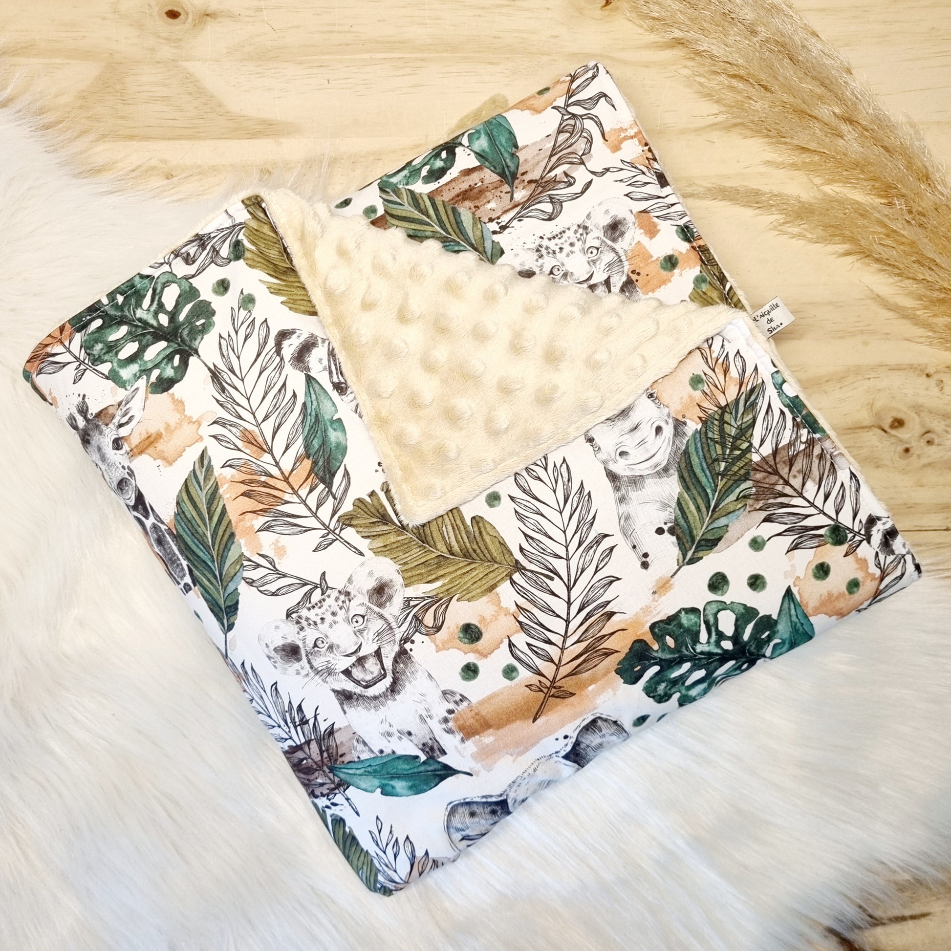 La couverture mesure 70x100cm ou 90x120 elle est doublée de minkee extra doux, le modèle hiver est molletonné pour plus de chaleur