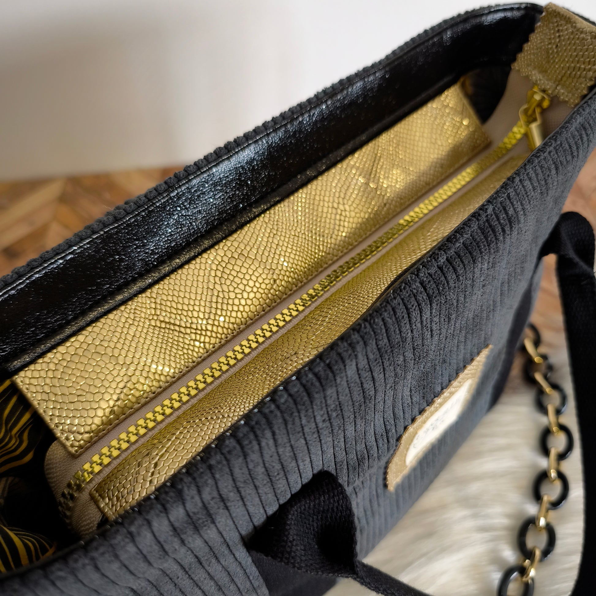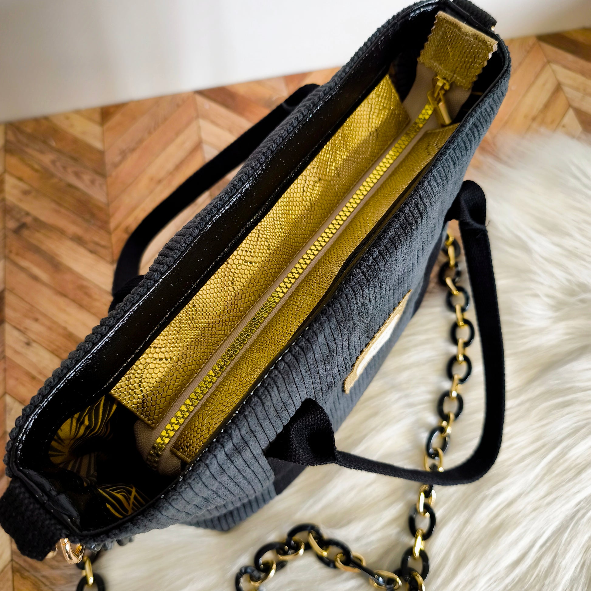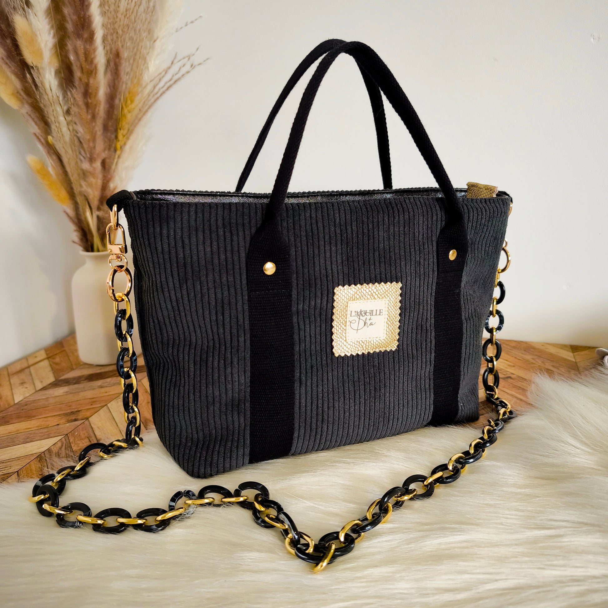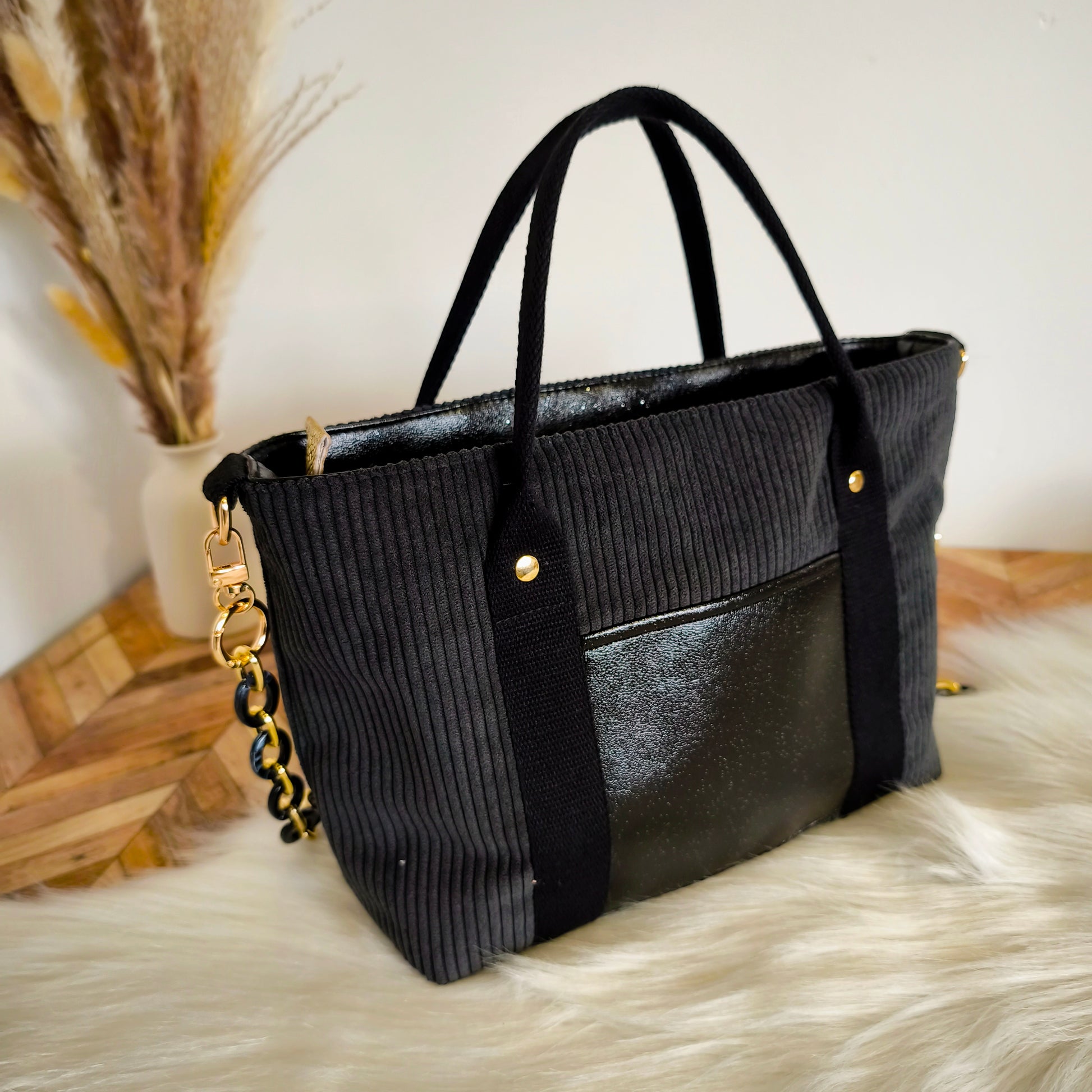 Découvrez ce superbe mini cabas, conçu pour allier élégance et fonctionnalité. Fabriqué en velours côtelé noir, il peut être porté à la main ou en bandoulière grâce à une chaîne en métal noir et doré, apportant une touche de sophistication à toutes vos tenues. Ce modèle unique se distingue par des détails raffinés en simili cuir doré effet croco autour de la fermeture, ainsi qu'en simili cuir noir pailleté à l'arrière et sur le haut intérieur, pour un look chic et intemporel.