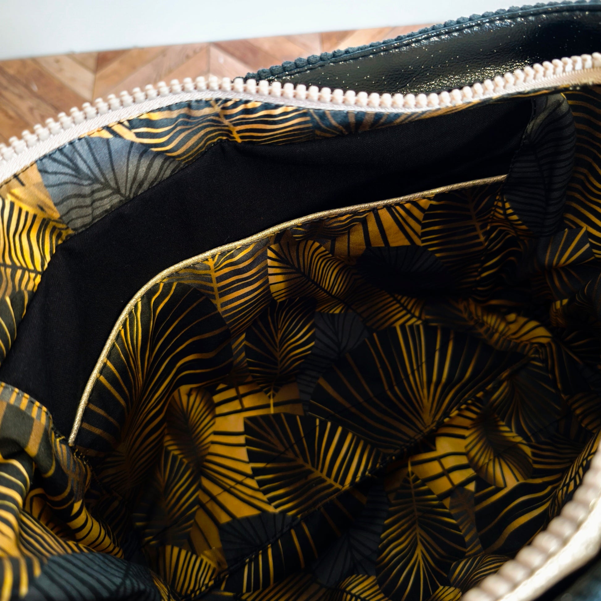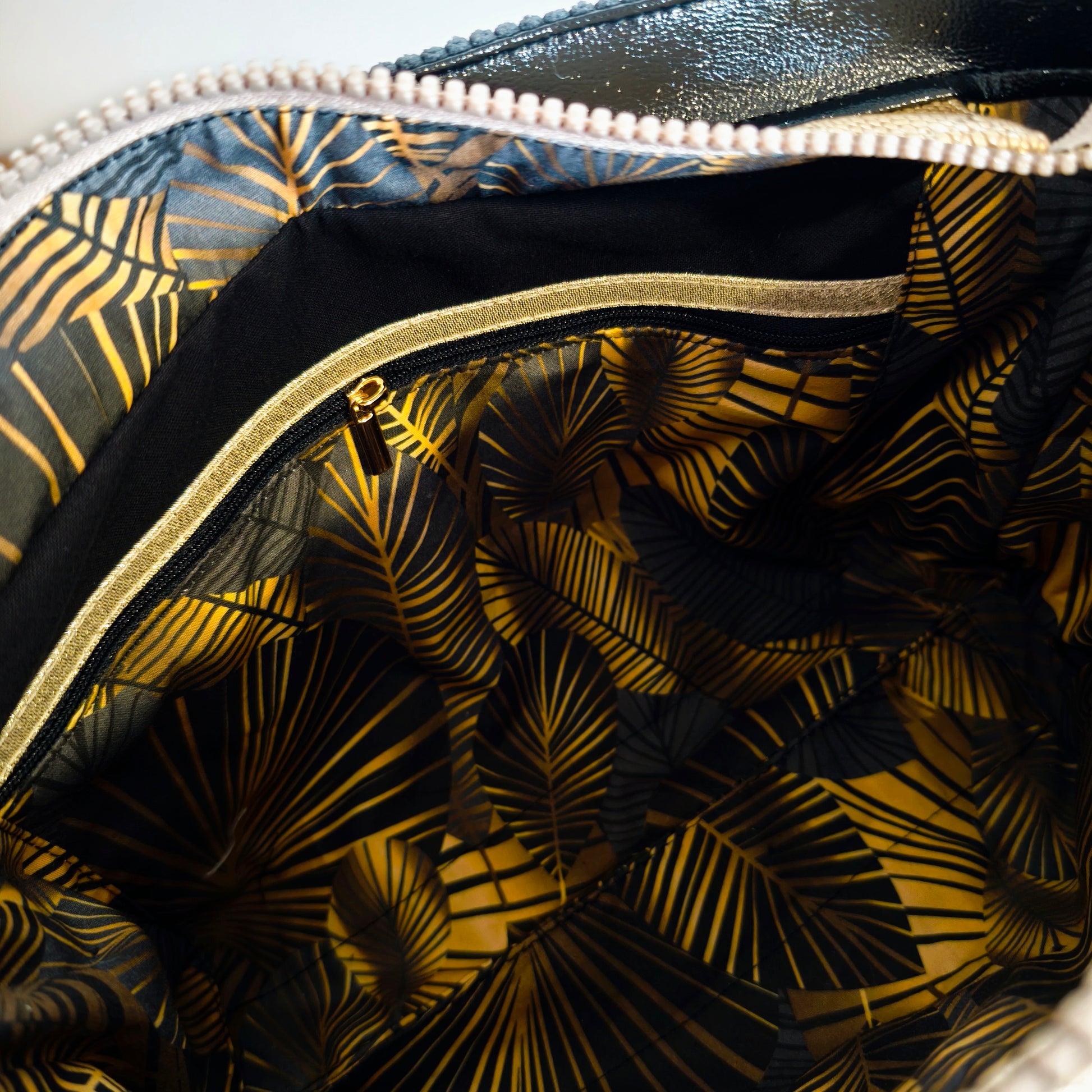 - Détails en simili cuir : Fermeture éclair ornée de simili cuir doré effet croco, ajout en simili cuir noir pailleté à l'arrière et à l'intérieur pour un style unique.