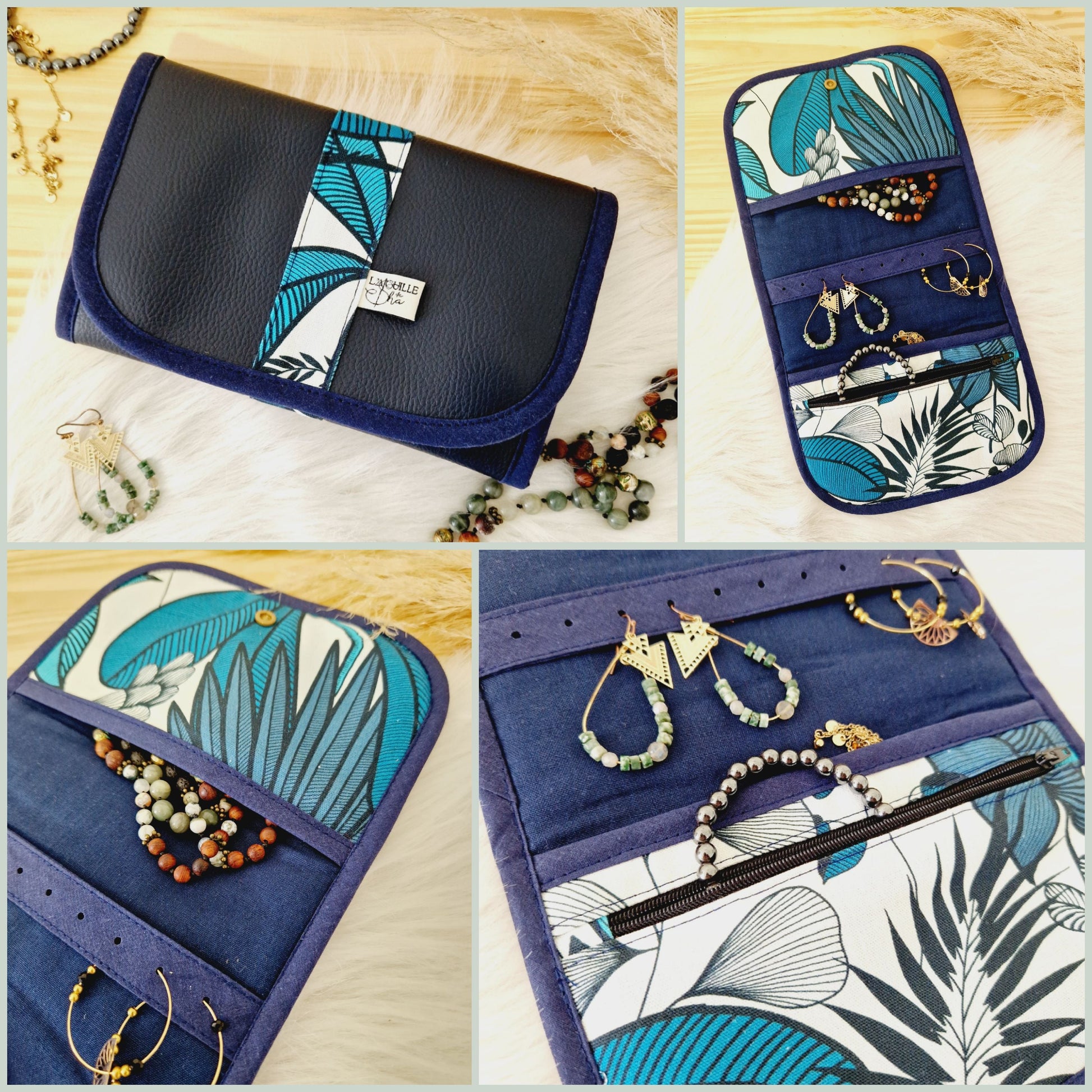 La pochette est composée de trois poches de rangement dont une avec fermeture eclair et un biais pour accrocher cinq paires de boucles d'oreilles ou pinces à cheveux